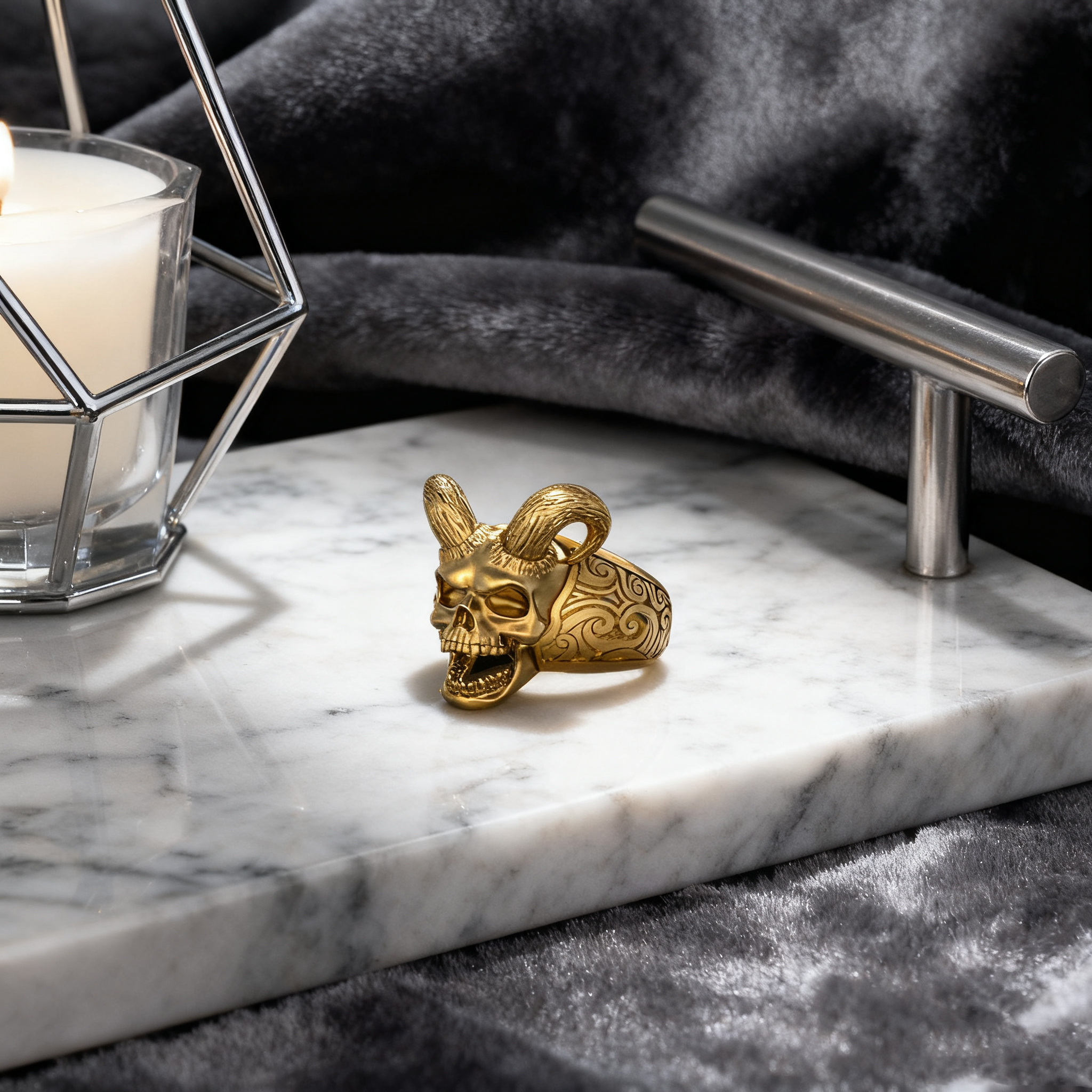 The devil skull design symbolizes power and fearlessness, with a sharp, layered shape that exudes a strong visual impact.