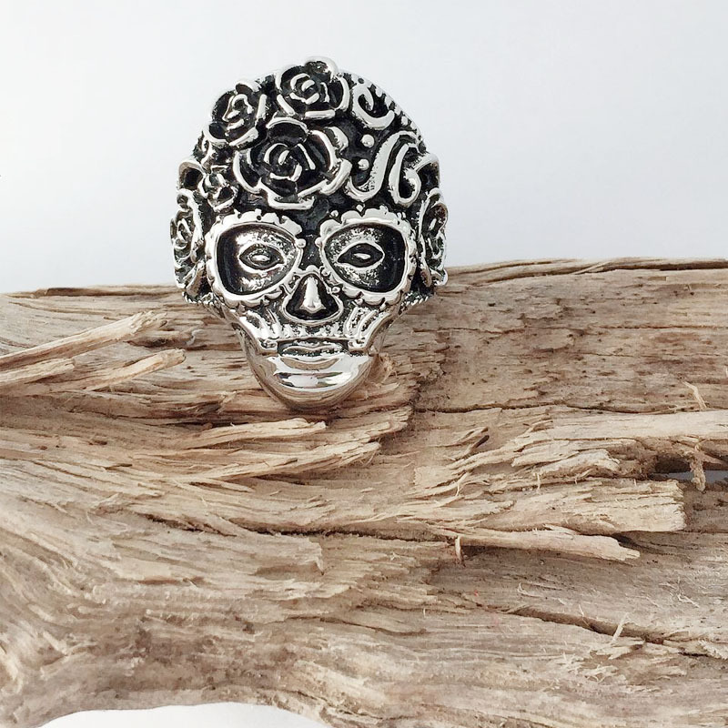 This skull and flower ring perfectly blends courage and elegance. The intricate design combines a striking skull motif with delicate floral details, embodying both strength and beauty. Weighing 15 grams, the ring is comfortable to wear, feels substantial, and is suitable for everyday wear or special occasions. Crafted from 925 sterling silver with a polished finish, this ring is durable and retains its shine for a long time. It can be worn alone as a focal point or layered with other rings to showcase confidence and individuality.