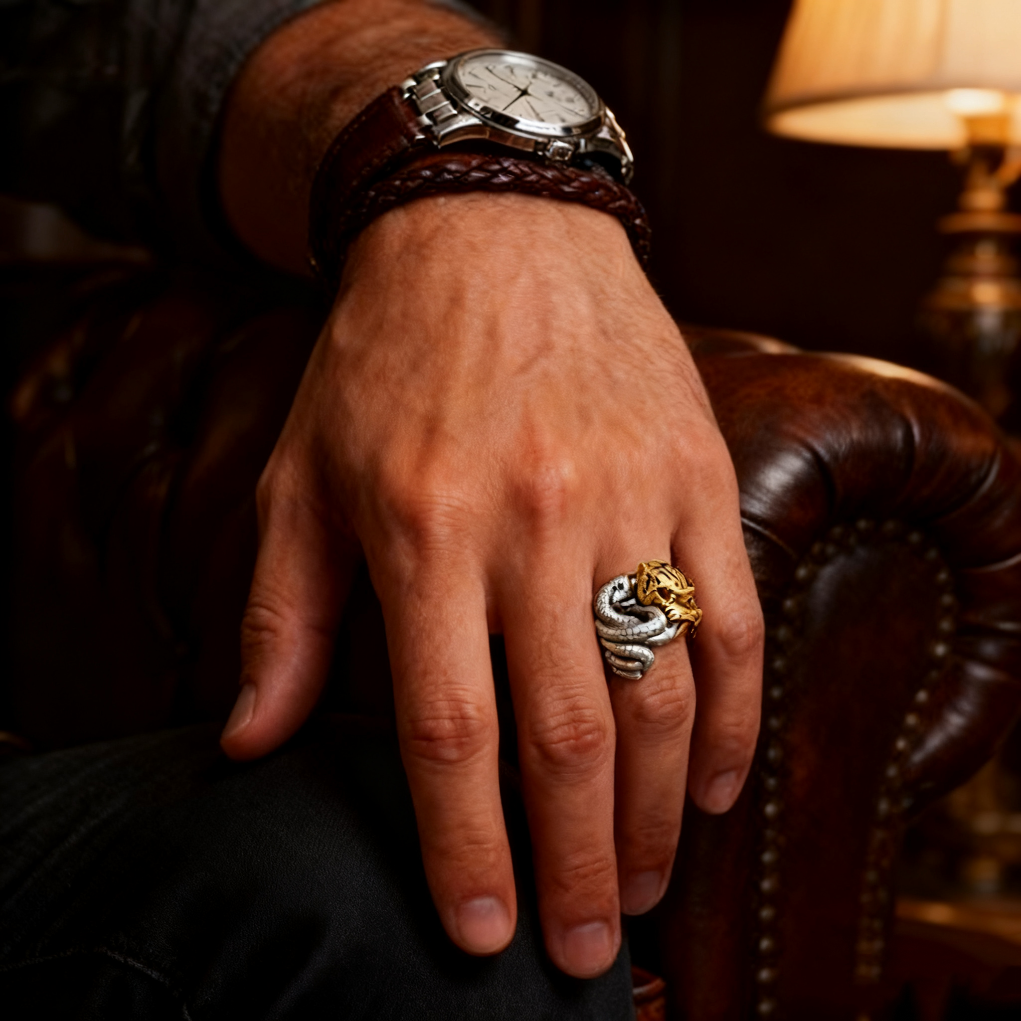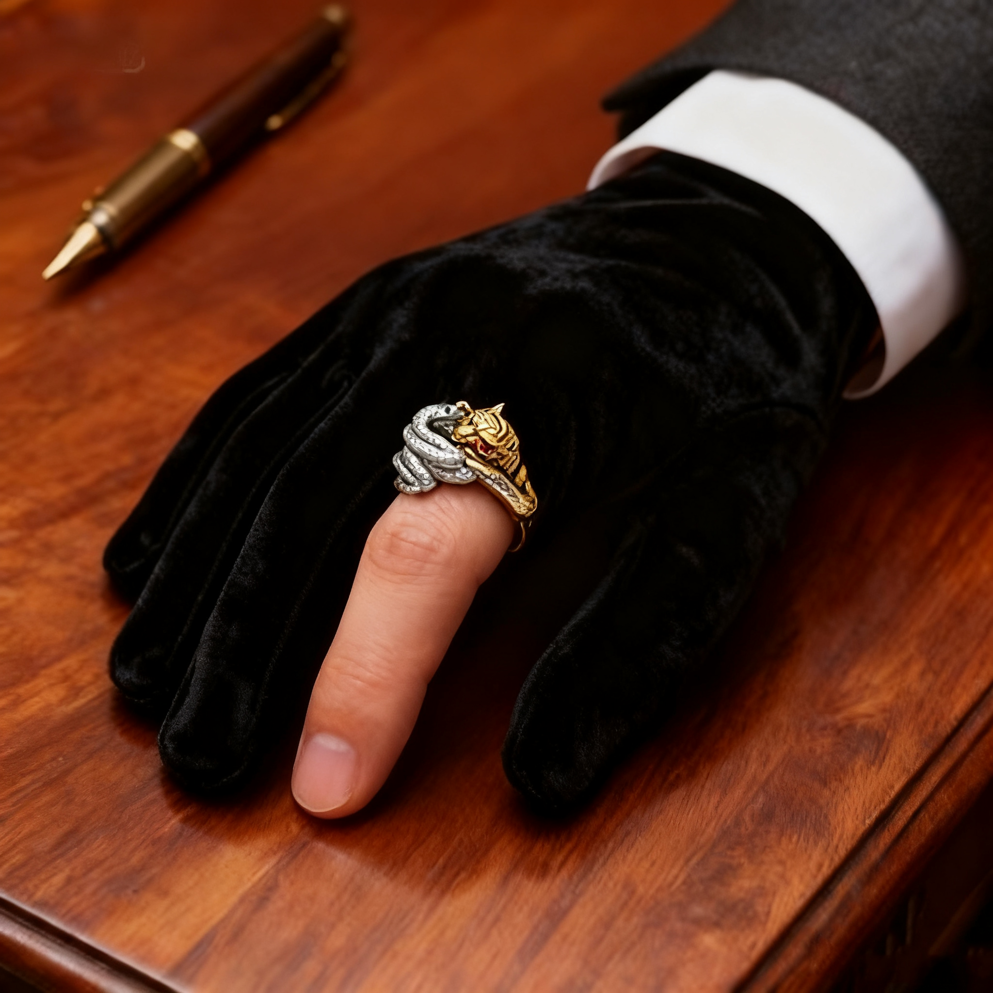 The "Snake and Tiger Struggle" ring captures the powerful aesthetics of a fleeting moment. Crafted with 925 sterling silver and gold plating, every detail is vividly sculpted. Wearing it not only showcases your taste but also symbolizes courage, wisdom, and an extraordinary personality. Whether for everyday wear, social gatherings, or as a collectible, it will make you the center of attention.